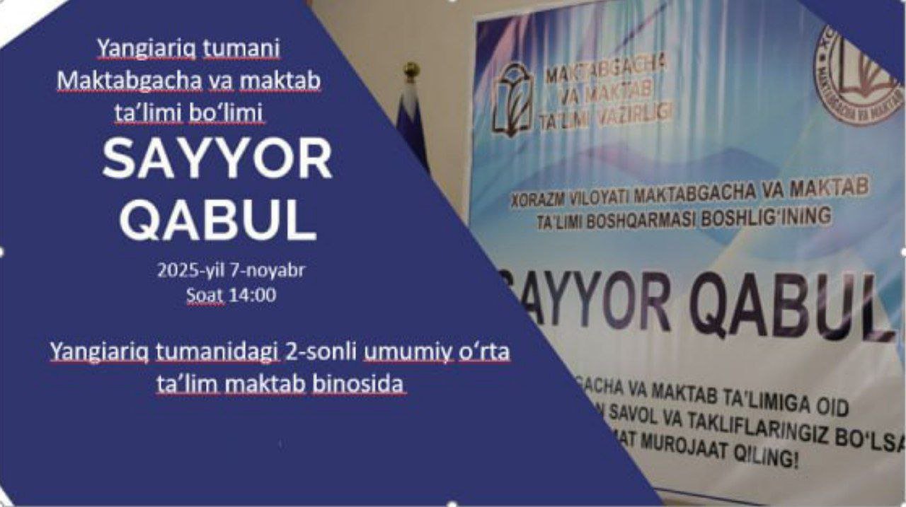 Bugun, 7-noyabr kuni Yangiariq tuman Maktabgacha va maktab ta’limi bo'limi boshlig‘ining navbatdagi sayyor qabuli Yangiariq tumani Shixbog'i mahallasida joylashgan 2-son umumta'lim maktabi binosida bo'lib o'tdi.